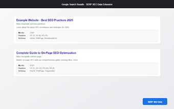 SERP SEO Data é uma extensão gratuita para Chrome que facilita a análise de SEO diretamente nos resultados de pesquisa do Google. Com essa ferramenta, os usuários podem visualizar informações cruciais como contagem de palavras, estrutura de cabeçalhos e dados estruturados logo abaixo de cada resultado de pesquisa. Isso permite uma compreensão mais aprofundada do conteúdo das páginas sem precisar acessá-las individualmente.